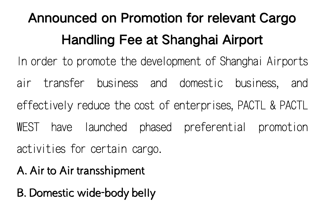 In order to promote the development of Shanghai Airports air transfer business and domestic business, and effectively reduce the cost of enterprises, PACTL & PACTL WEST have launched phased preferential promotion activities for certain cargo.